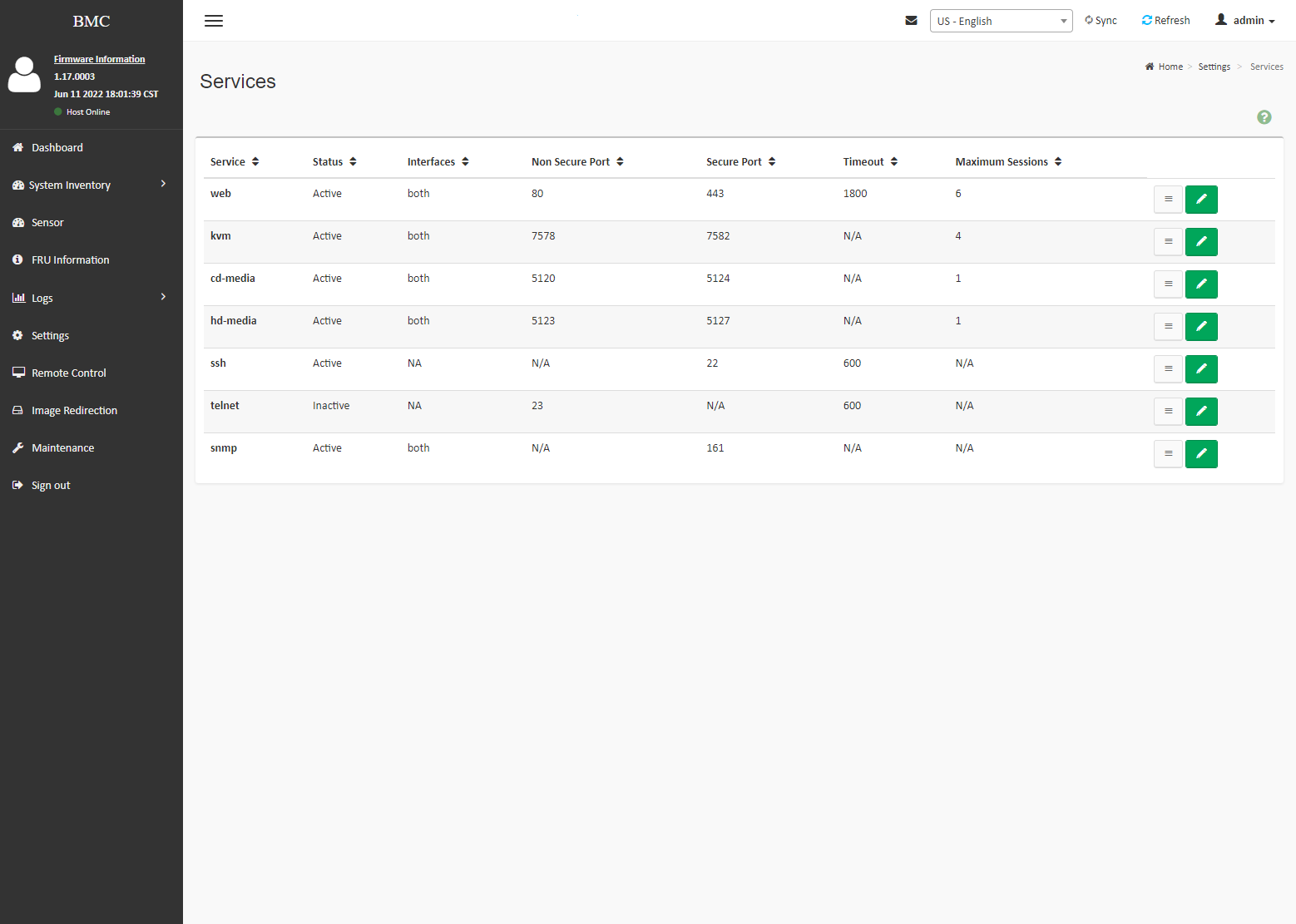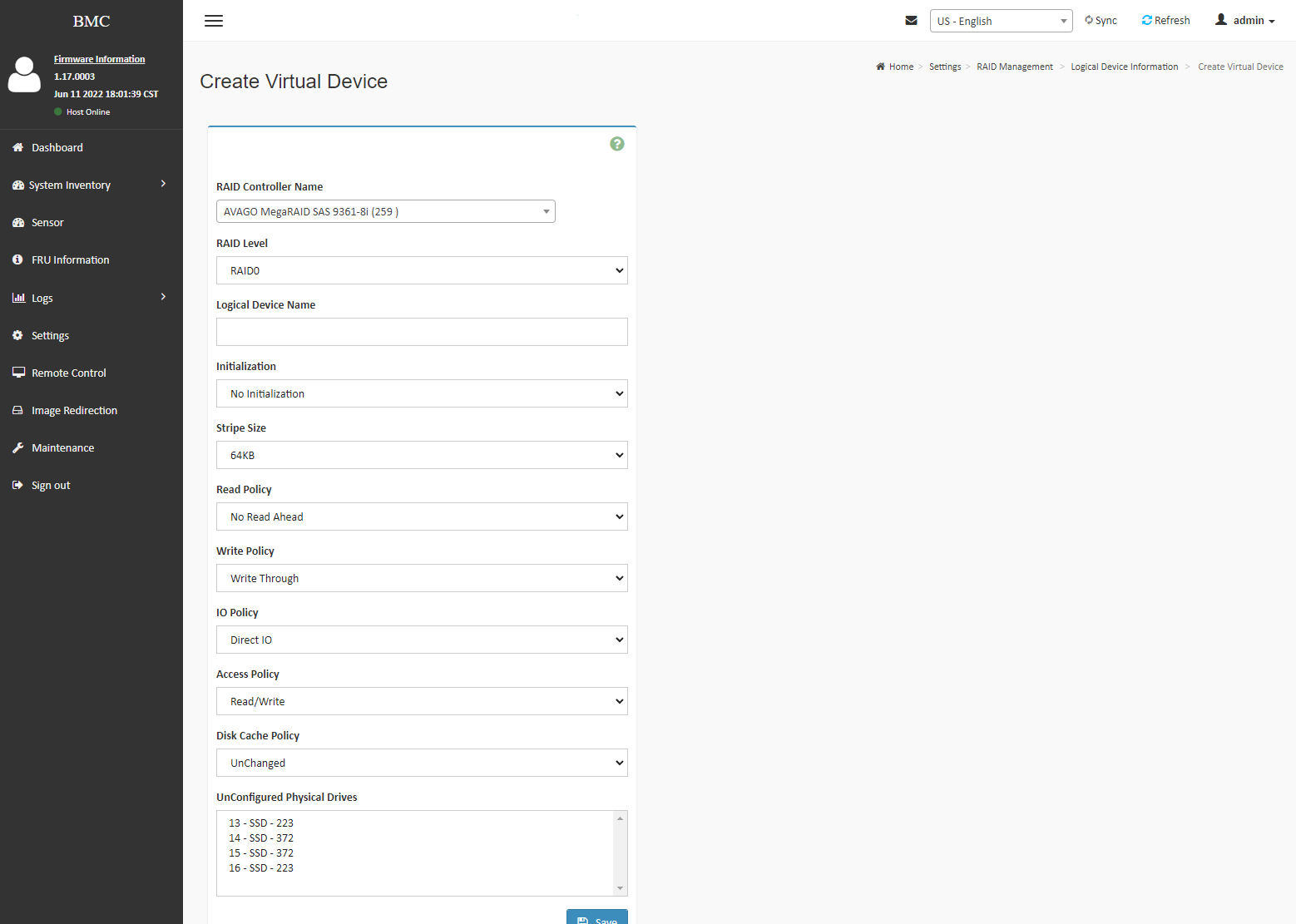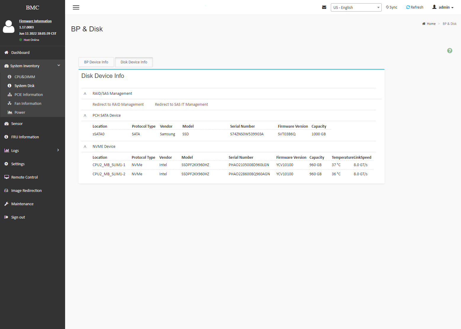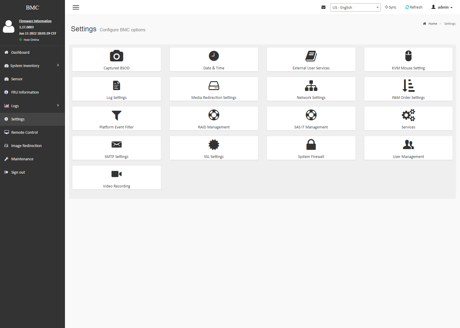 Из настроек BMC наиболее часто используемыми будут управление аккаунтами пользователей, параметры сетевого подключения и сервисов, дата и время, отправка уведомлений, управление виртуальными носителями. Также может представлять интерес доступ к RAID/HBA-контроллерам, включая внешние, для настройки дисковой подсистемы.