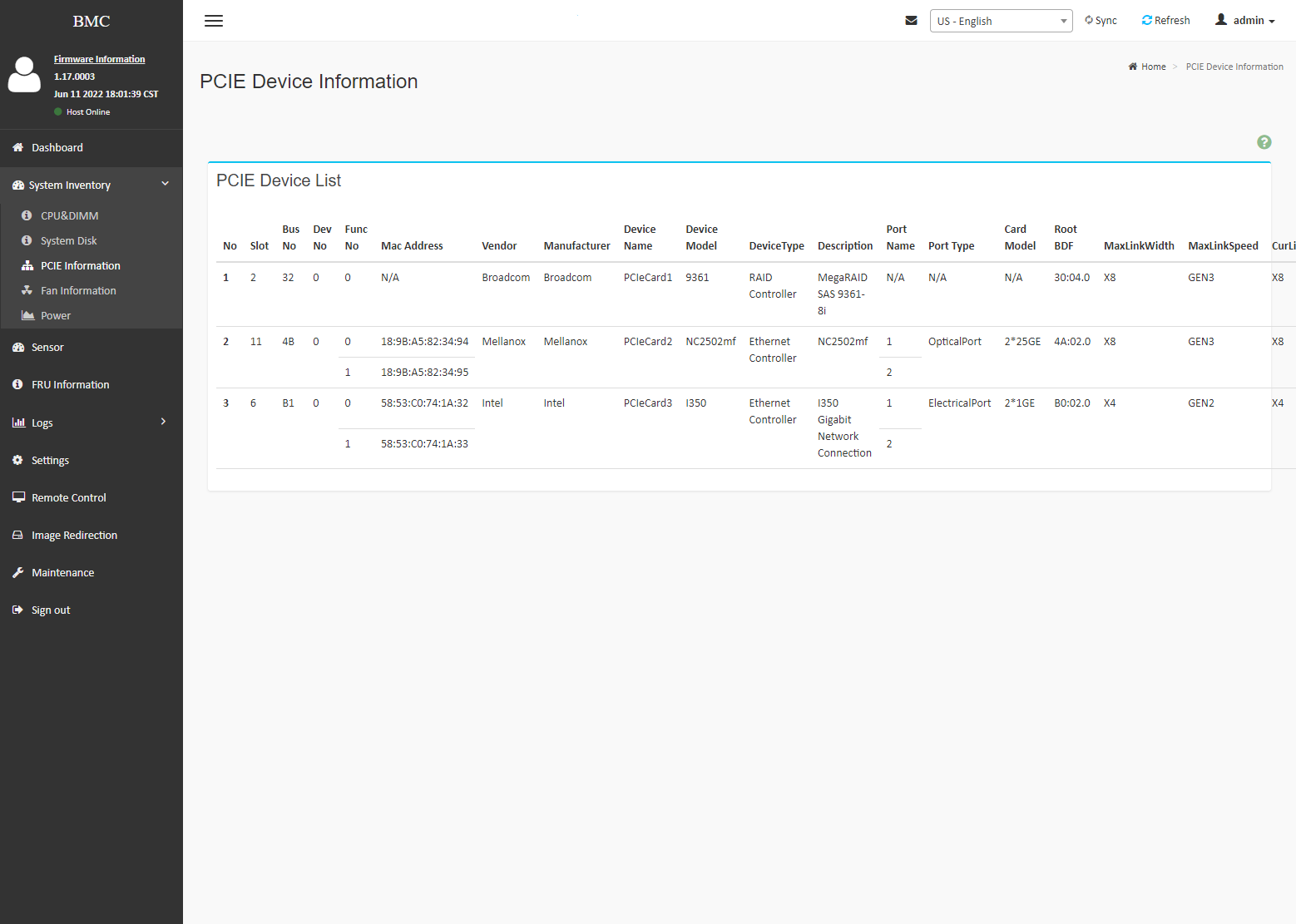 Вторая группа меню — инвентаризация. Здесь можно узнать подробности о процессорах, модулях оперативной памяти, накопителях, платах расширения, вентиляторах, блоках питания. Причем в нашем случае, когда накопители U.2 подключены к шине процессора, выводится информация не только о них, но и о бекплейне. Про платы расширения тоже много данных — параметры шины подключения, производитель, MAC-адреса и тип портов для сетевых карт. Жаль только, что даже на Full HD-мониторе всего сразу не увидеть, а горизонтальной прокрутки нет. Далее также можно встретить пункт FRU Information, где приводятся данные о платформе.