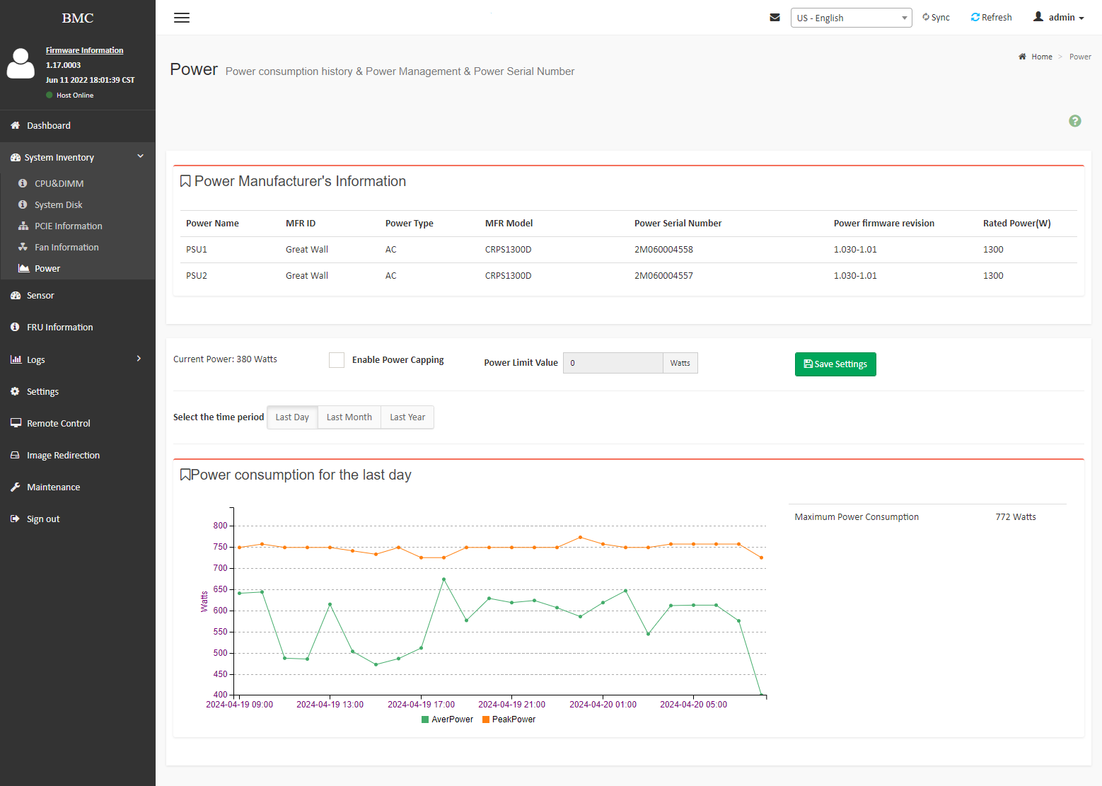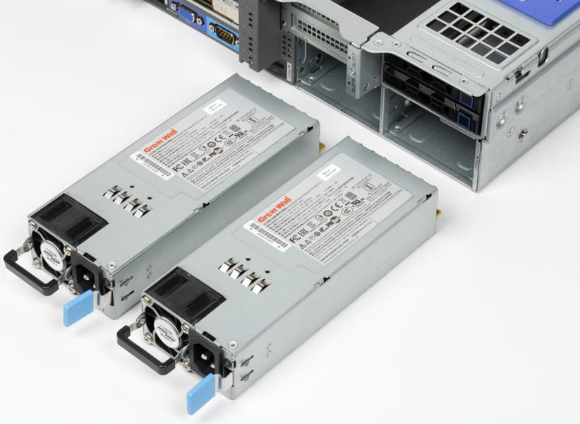За питание сервера отвечают два блока Great Wall GW-CRPS1300D — как уже понятно из названия, имеющие формат CRPS и мощность 1300 Вт. Опционально для данной модели сервера поставляются также модели другой мощности до 2000 Вт включительно.