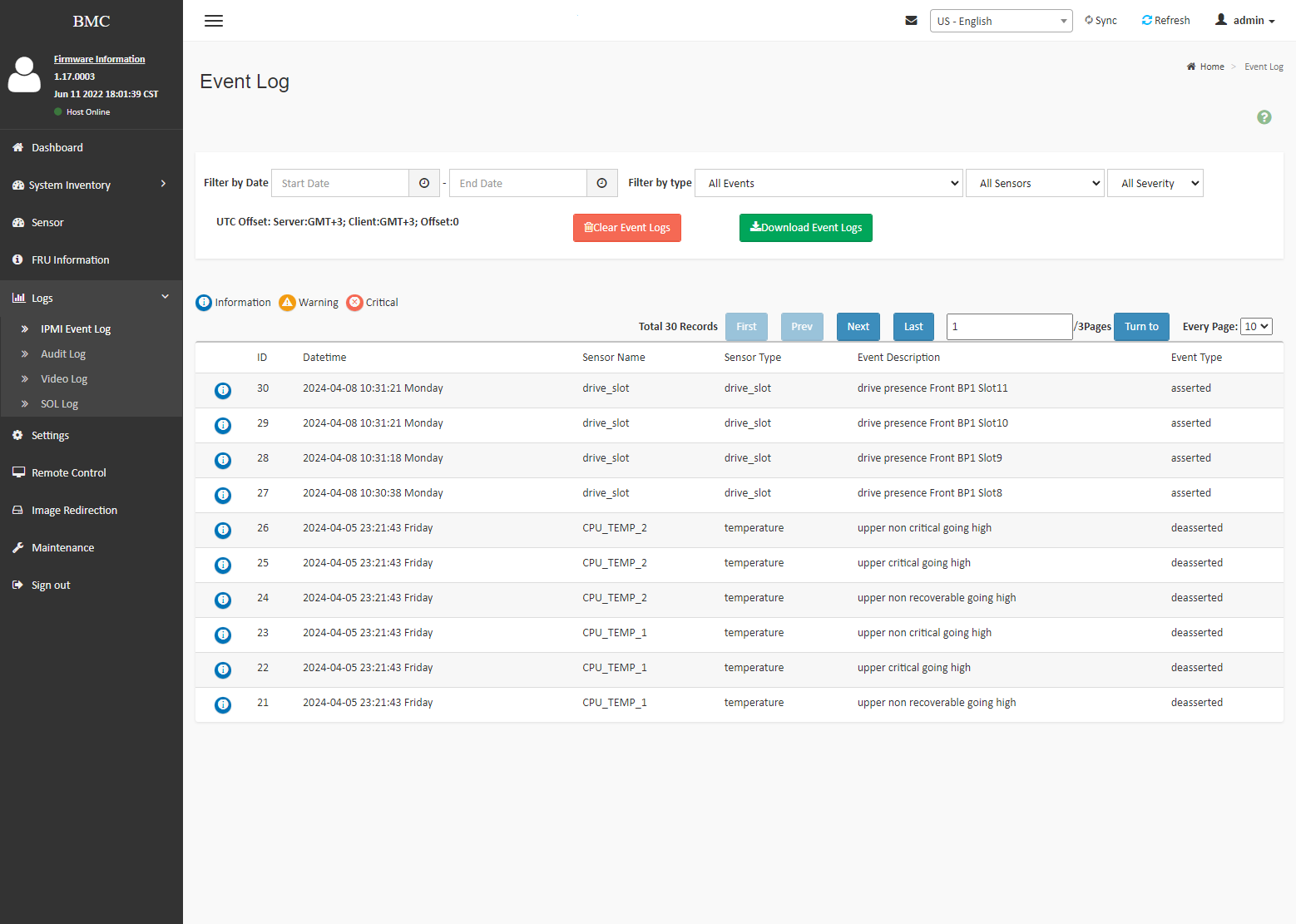 Конечно, есть и традиционный раздел с сенсорами — статус присутствия, температуры, вентиляторы, напряжения, токи и так далее. В контроле работы за сервером пригодятся и журналы событий, где записываются как системные события, так и обращения к IPMI.