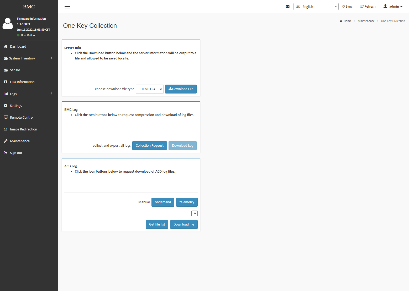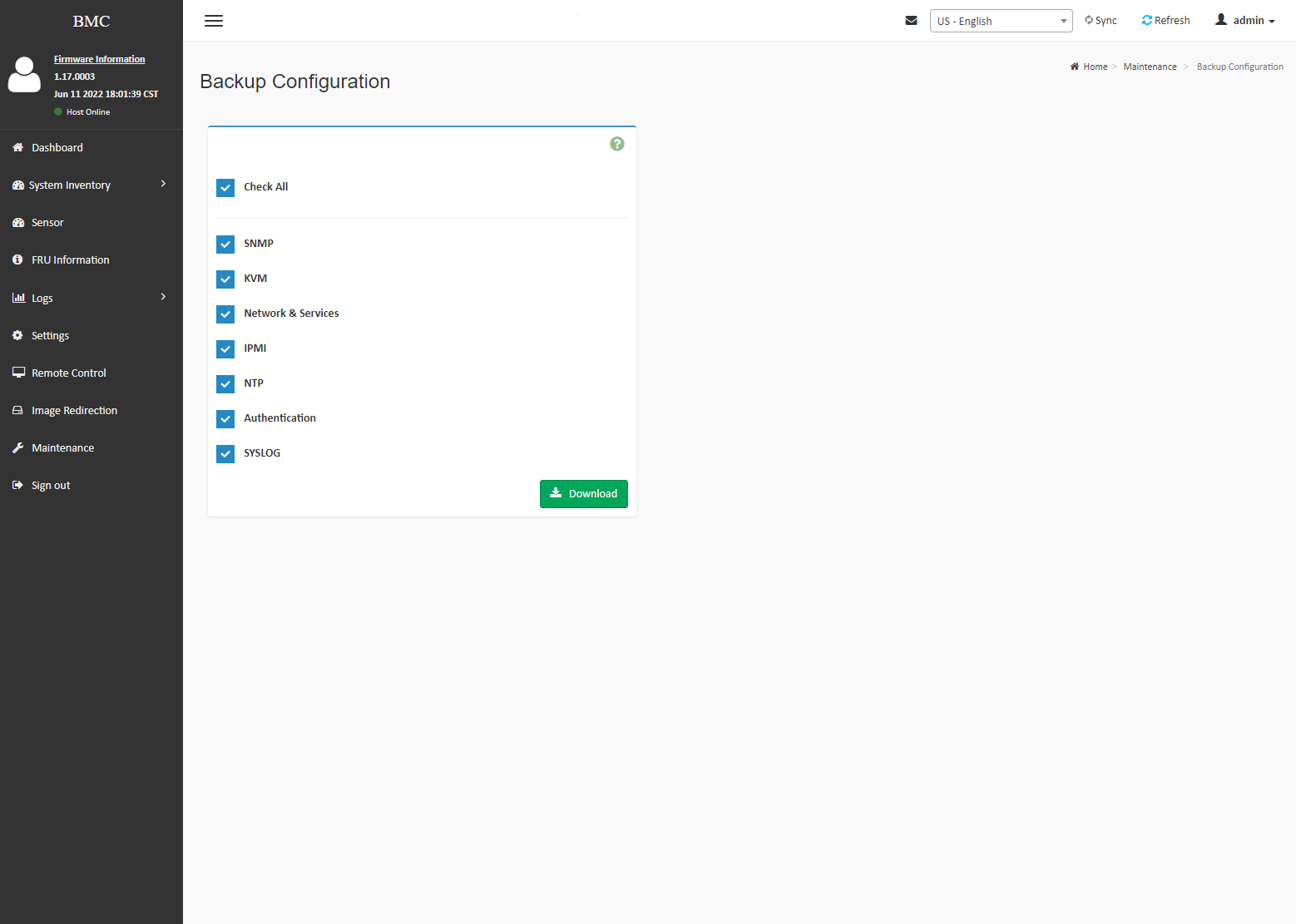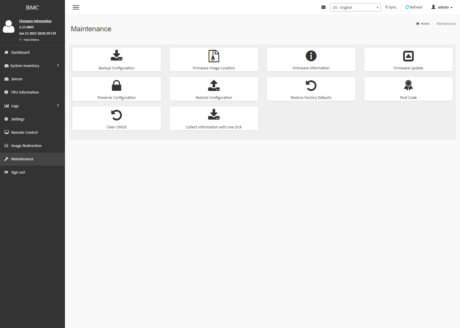 В разделе обслуживания находятся функции работы с самим BMC — обновление прошивки и управление конфигурацией, а также сброс настроек BIOS и просмотр кода POST. Кстати, здесь есть и полезная опция по скачиванию одним файлом информации об аппаратной конфигурации сервера. А вот возможность обновления BIOS отсутствует.