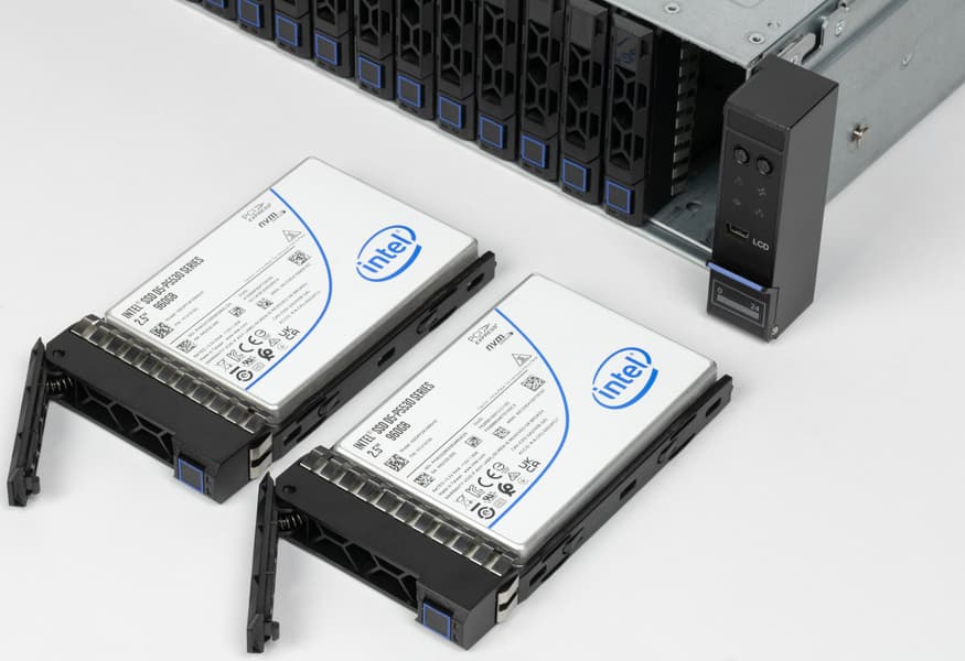 В частности, недавно мы проверили работу современного аппаратного RAID-контроллера с твердотельными накопителями SATA и U.2, а в этот раз имеем возможность оценить работу NVMe при прямом подключении по PCIe к серверному процессору. Intel D5-P5530 выпускается уже несколько лет, для него заявлены скорости последовательного чтения и записи в 5500 и 1600 МБ/с соответственно, а на случайных операция с блоками размером 4 КБ производитель заявляет 300000 и 75000 IOPs для чтения и записи соответственно. Установленная в сервере платформа поддерживает технологию Intel VROC — организацию RAID-массивов на базе накопителей NVMe и процессоров Xeon. Однако базовый вариант без дополнительных лицензий умеет делать только RAID0, да и накопителей у нас в этот раз только два. Поэтому мы решили посмотреть на работу стандартного для Linux пакета mdadm. Для сравнения мы также протестируем и установленные в сервере M.2-накопители, подключенные к чипсету. Напомним только, что там используется PCIe 3.0 x2, что будет ограничивать скорость значением около 2 ГБ/с (впрочем, и сами накопители явно бюджетного сегмента).