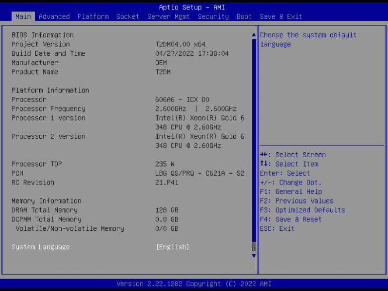 По информации из IPMI, сервер собран на базе платформы TTY TU628V2 и в нем установлена материнская плата T2DM. Версии BIOS и BMC — от 2022 года, обновлений в сети найти не удалось. Материнская плата и корпус разрабатывались совместно, так что отделить одно от другого не получится, а технические характеристики имеет смысл описывать совместно.
