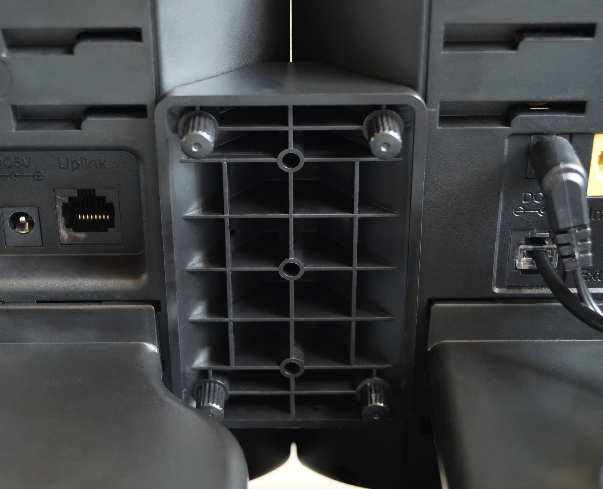 В днище корпуса, слева и справа, предусмотрены углубления с резьбой. Первая пара предназначена для крепления устройства к телефонному аппарату, с которым будет осуществляться связь. Для этого используется специальный кронштейн, имеющийся в комплекте с консолью. Другая пара резьбовых углублений, находящаяся на противоположной стороне корпуса, понадобится для присоединения второй консоли, если функциональности одной окажется недостаточно.