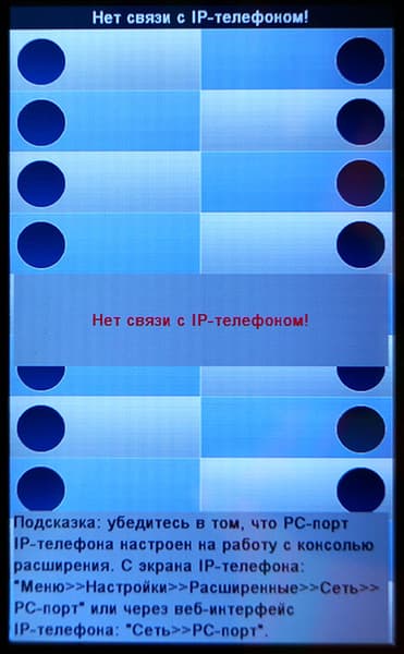Во время тестирования консоль подключалась к IP-телефону Htek UC924E RU, обзором этого аппарата мы начинали знакомство с VoIP-оборудованием Htek. При первом запуске (подаче питания) консоль отображает на дисплее пустые пока строки контактов и функций, а также выводит оповещение об отсутствии связи с телефоном. Здесь же имеется подсказка-руководство для пользователя.