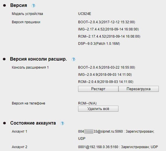 Сам телефон, к которому «прицеплялась» консоль, продолжал работать в двух аккаунтах: trial-номер в одном из популярных интернет-ресурсов, который специализируется на IP-телефонии, и номер в мини-АТС на базе Asterisk, которая работала в локальной сети. Эти сведения также отображаются на стартовой страничке телефона в разделе Состояние аккаунта.