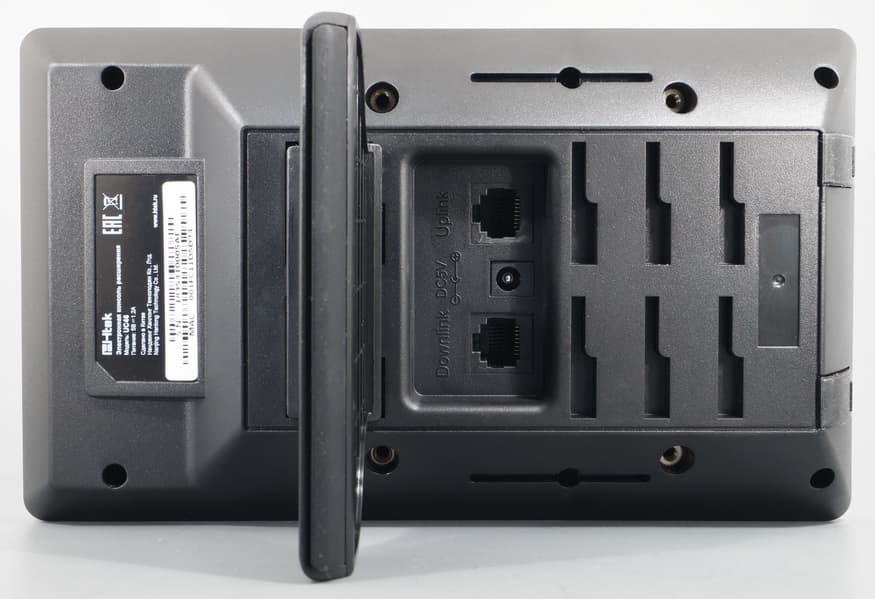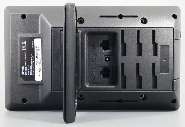Два разъема LAN, входящий и выходящий, находятся на задней стороне корпуса, в углублении. Между ними расположен разъем питания. В него можно подать ток не только с адаптера, но и со специального порта IP-телефона, к которому подключена консоль.