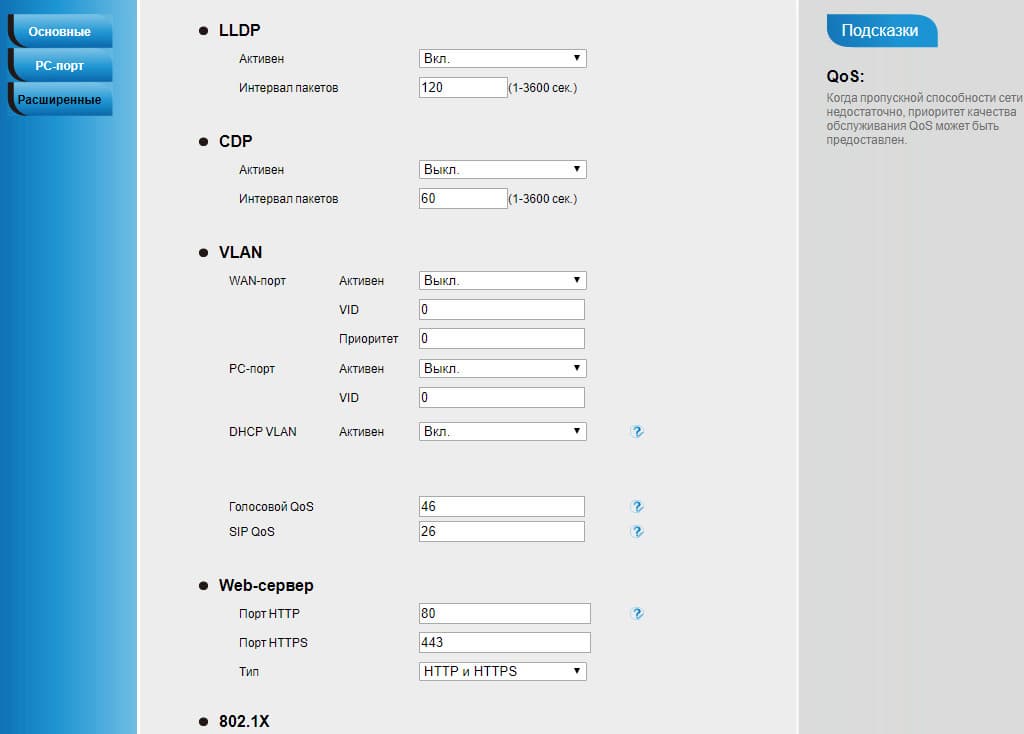 Способы подключения к сети выбираются и настраиваются в соответствующей вкладке настроек прибора. Здесь можно ввести статический IP либо оставить работающим DHCP, ввести логин/пароль для подключения по протоколу PPPoE, выбрать режим использования LAN-портов телефона (мост позволяет подключить телефонный аппарат и компьютер к одной LAN-розетке), осуществить переадресацию/проброс портов, а также изменить порты основных протоколов и стандартов, поддерживаемых аппаратом.