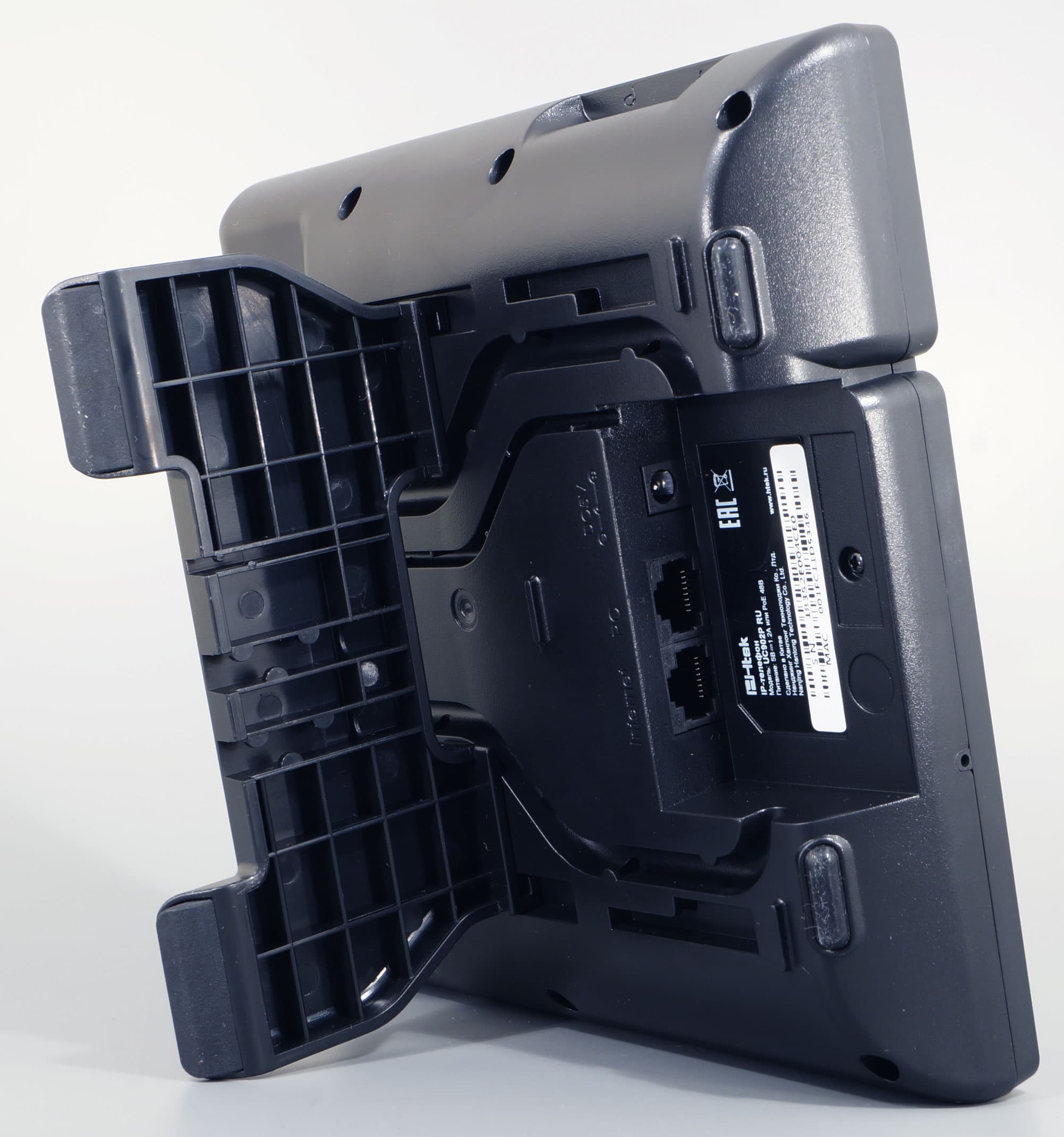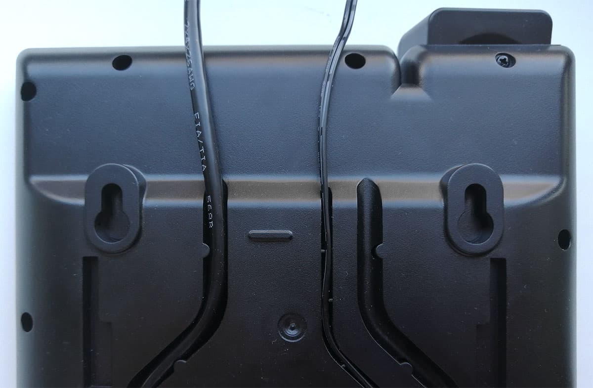 Разъем питания и два сетевых RJ45 находятся в удобном углублении по центру днища, а кабели, идущие от этих разъемов, укладываются в канавки с фиксаторами. Для крепления телефона к стене в днище корпуса предусмотрены стандартные ушки для шляпок саморезов.