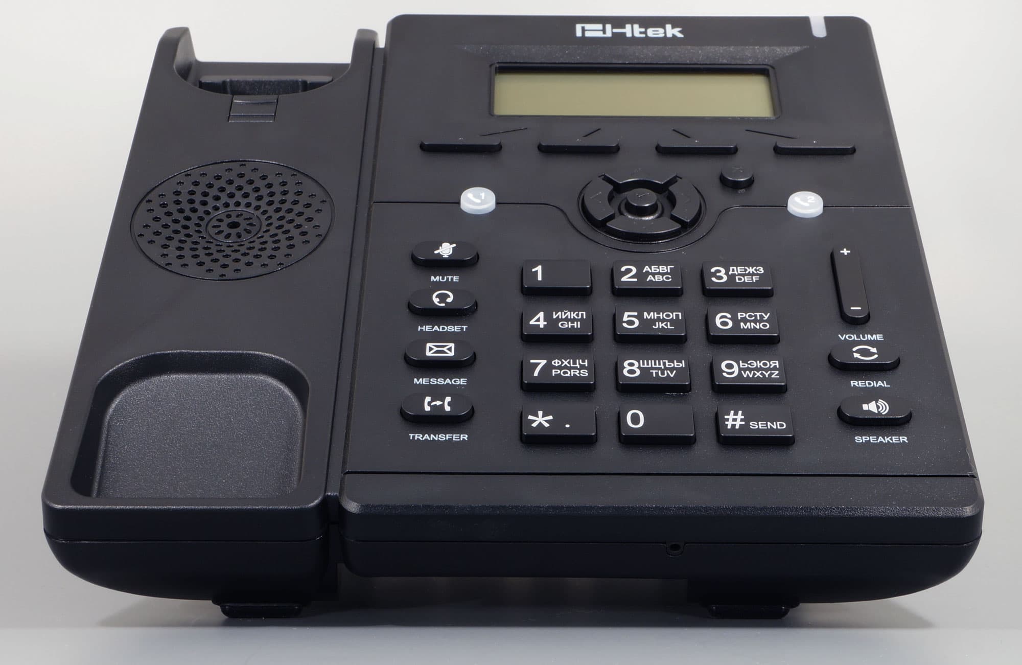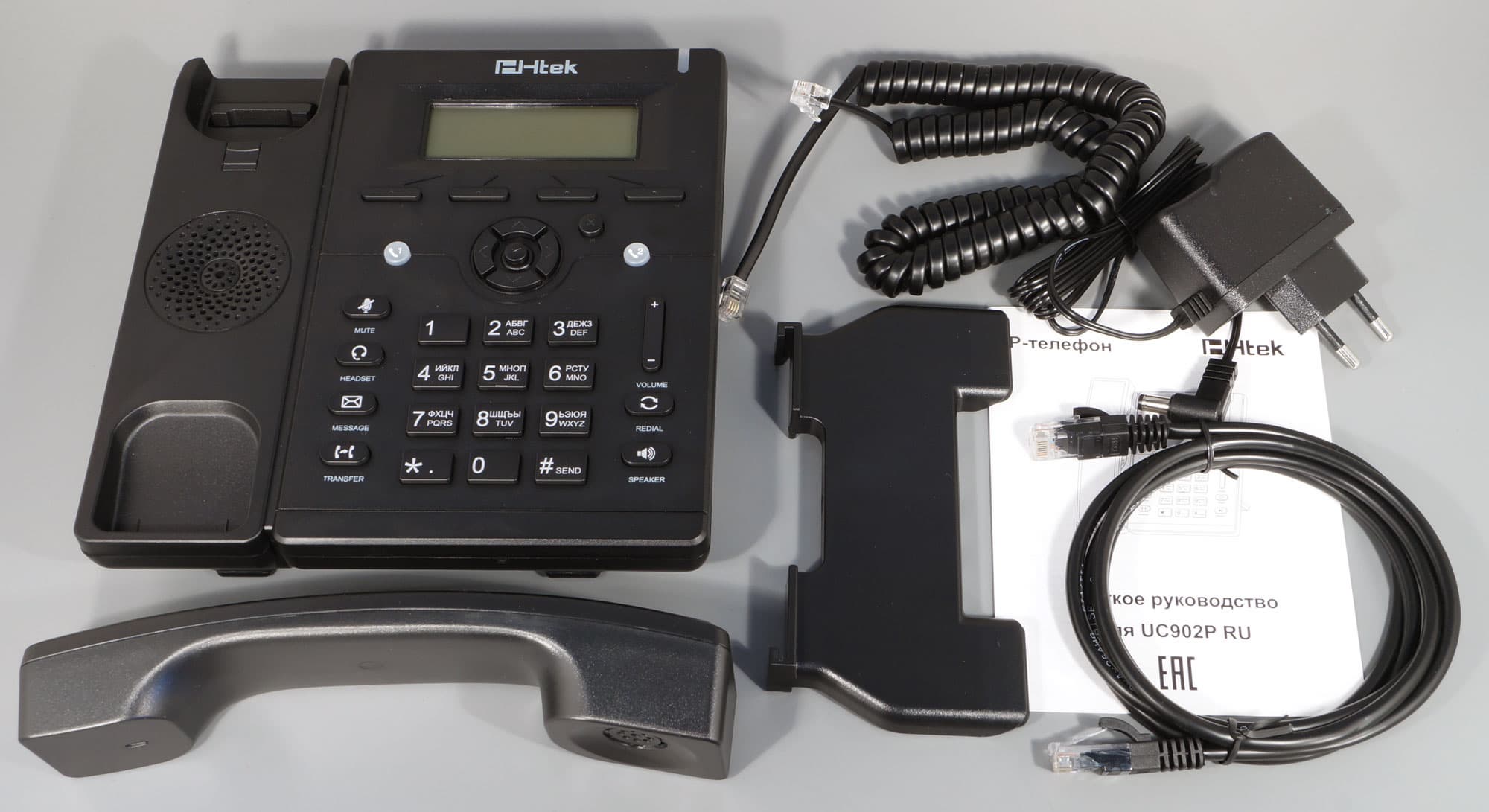 Два устройства из списка мы уже освоили, это продвинутый IP-телефон Htek UC924E RU и аппарат базового уровня Htek UC912E RU. Теперь, почти на финише обзорного Htek-марафона, обратим внимание на типичную «рабочую лошадку», одну из младших моделей: Htek UC902P RU. Этот телефон позиционируется как аппарат начального уровня, предназначенный для рядовых сотрудников или работников call-центра, «сидящих» на одной-двух телефонных линиях. А отсутствие буквы E в названии аппарата указывает на отсутствие в телефоне беспроводных адаптеров Wi-Fi и Bluetooth.