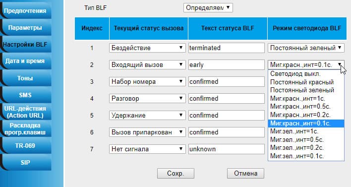 Прочие настройки, находящиеся во вкладке Параметры, так или иначе повторяют функции, доступные в упомянутом решении компьютерной телефонии. Правда, с небольшими особенностями, которые описывают конкретную модель телефона. Например, поведение светодиодного индикатора для разных статусов можно запрограммировать так, что и бывалый разведчик будет долго заучивать все эти последовательности.