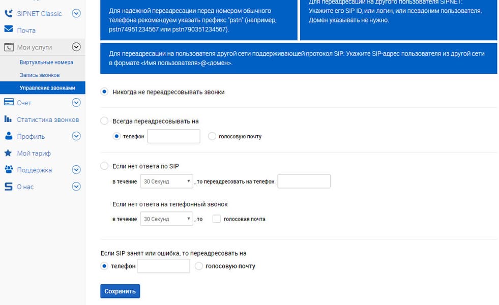 Этот сервис, как и другие ему подобные, вполне способен удовлетворить стандартные запросы. Здесь имеется возможность выдачи городских номеров, присутствует настройка переадресации входящих звонков на городские и даже мобильные номера. Также можно включить запрет на входящие звонки с городских номеров, перенаправить вызов на голосовую почту и т. д. Функциональность можно увеличить кратно, она зависит от выбранного тарифа.