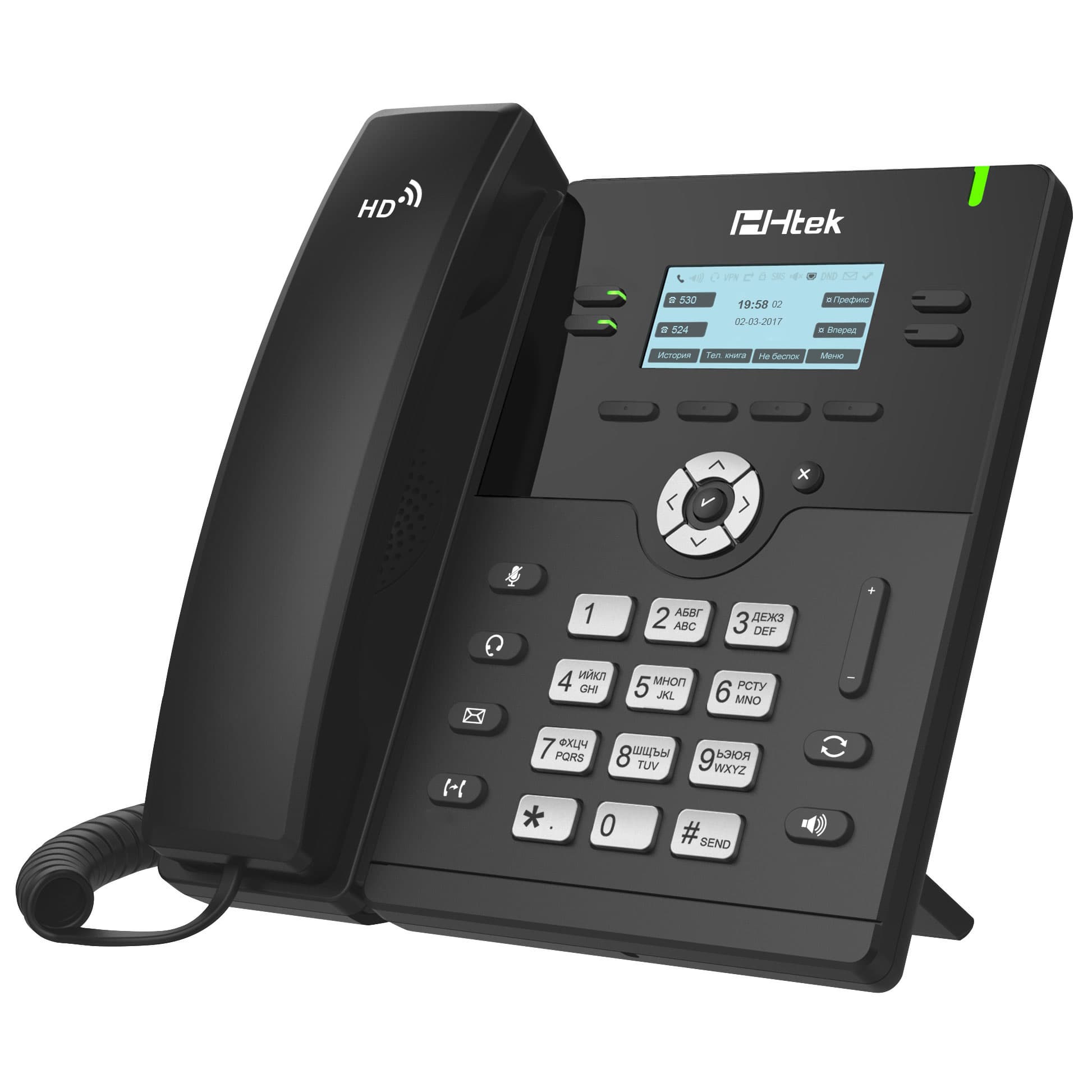 В рамках познавательного процесса обратимся к аппарату Htek среднего, даже базового уровня: Htek UC912E RU. Этот телефон предназначен для установки на рабочий стол сотрудников, если можно так выразиться, среднего звена.