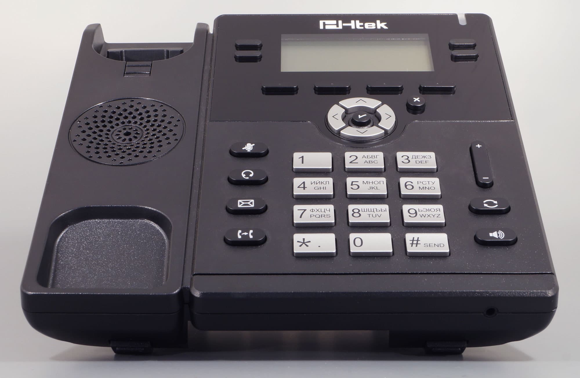 В центре площадки для трубки находится решетка встроенного динамика спикерфона. Как и во всех IP-телефонах Htek, качество монтажа и изоляции от корпуса этого спикерфона не вызывает нареканий.