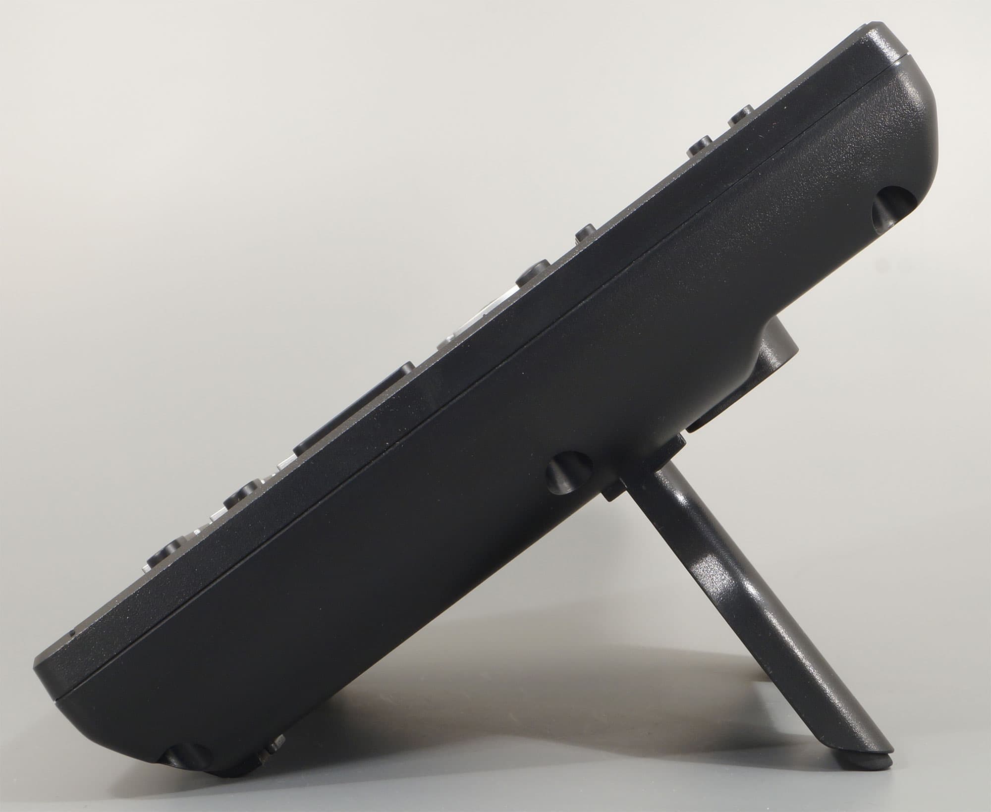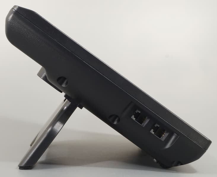 Угол наклона корпуса при расположении телефона на горизонтальной поверхности регулируется положением комплектной подставки. В левую боковую грань корпуса встроены два разъема RJ9 (4P4C) для подключения трубки и проводной гарнитуры.