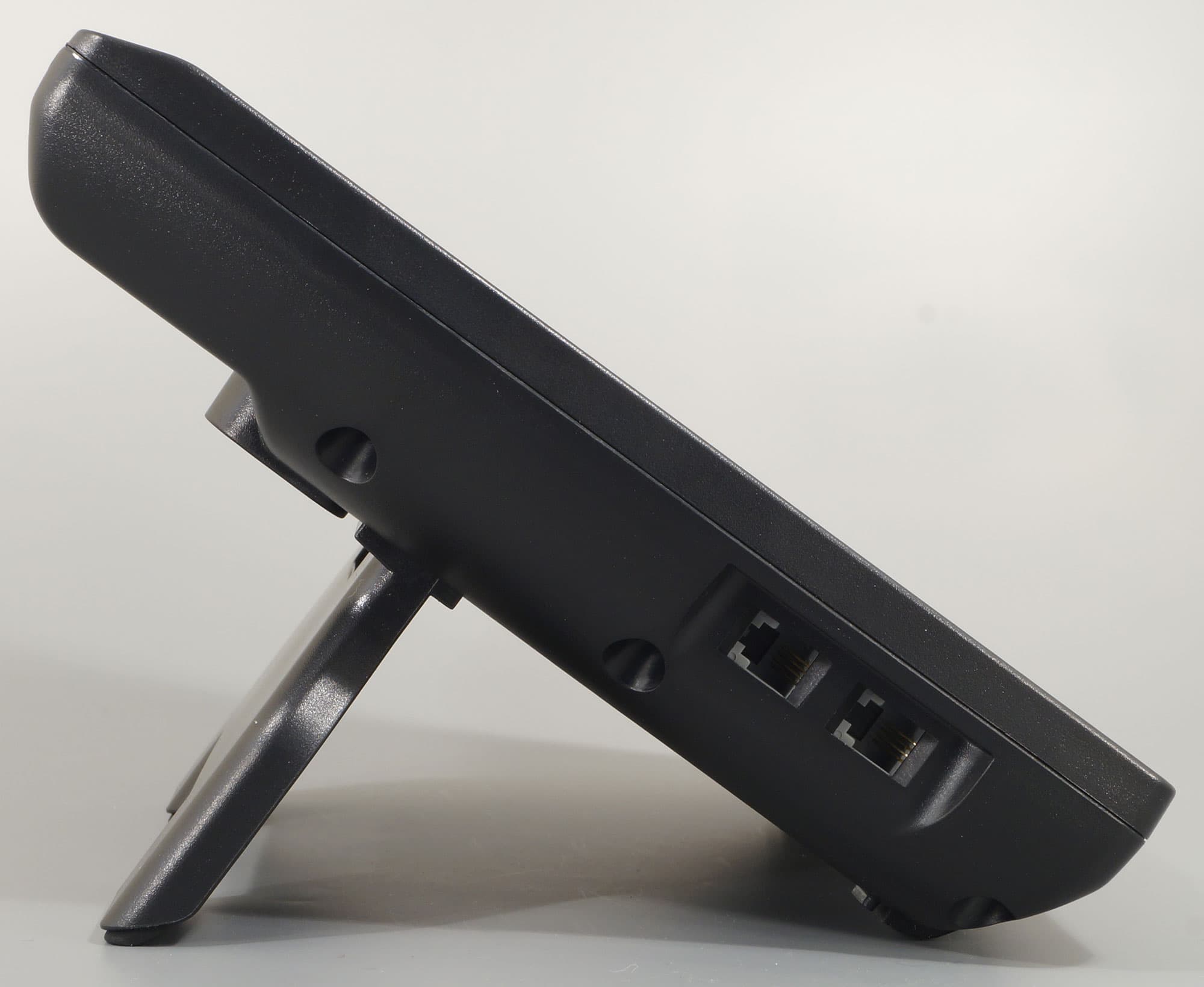 Прочие интерфейсы находятся в углублении, которое обустроено в днище корпуса: разъем питания и два Ethernet 10/100 Мбит/с, которые могут работать в режиме настраиваемого моста, позволяя подключить телефон и находящийся рядом компьютер к одной LAN-розетке. Для крепления кабелей, идущих от каждого разъема, в днище предусмотрены изогнутые канавки с фиксаторами. Они выводят провода к тыльной стороне корпуса, где торчащие хвосты никак не помешают.