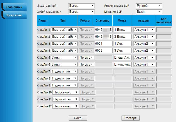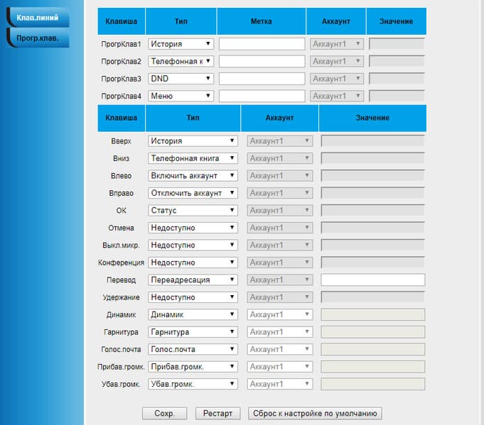 Можно видеть, что задание функций допускается двенадцати клавишам линии. Здесь повторяется ситуация с рассмотренной ранее моделью телефона Htek UC924E RU: физических клавиш на телефоне четыре, это втрое меньше, чем доступно в настройках.