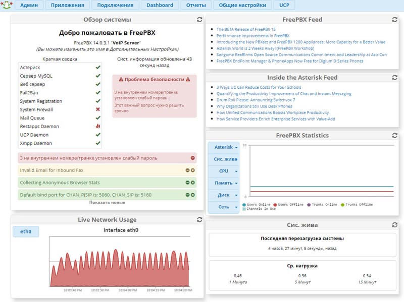 Это «отчуждение» никак не влияло на связь или настройки аппарата. Можно даже считать, что телефон работал в составе удаленного филиала организации. Причем организации, в которой имеется своя собственная внутренняя АТС. Она работала на ПК в виртуальной машине на сборке FreePBX.