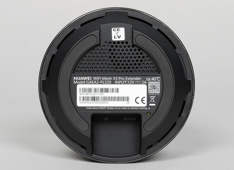 Дополнительный узел немного проще — в нем установлен только один сетевой порт на 1 Гбит/с, а характеристики беспроводной части аналогичны базовому блоку. При этом требования к блоку питания такие же, как у основного устройства, а снизу тоже видна решетка вентилятора.