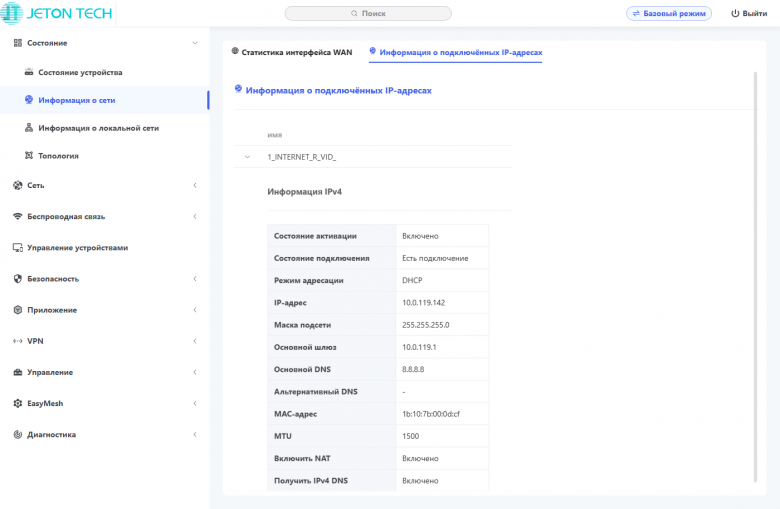 К сожалению, на схеме не показывается информация о подключении между узлами (только его тип). Но судя по скорости, работает именно Wi-Fi 6 в диапазоне 5 ГГц. Как мы видим, это неплохой вариант для подключения не оборудованных быстрым беспроводным адаптером клиентов.