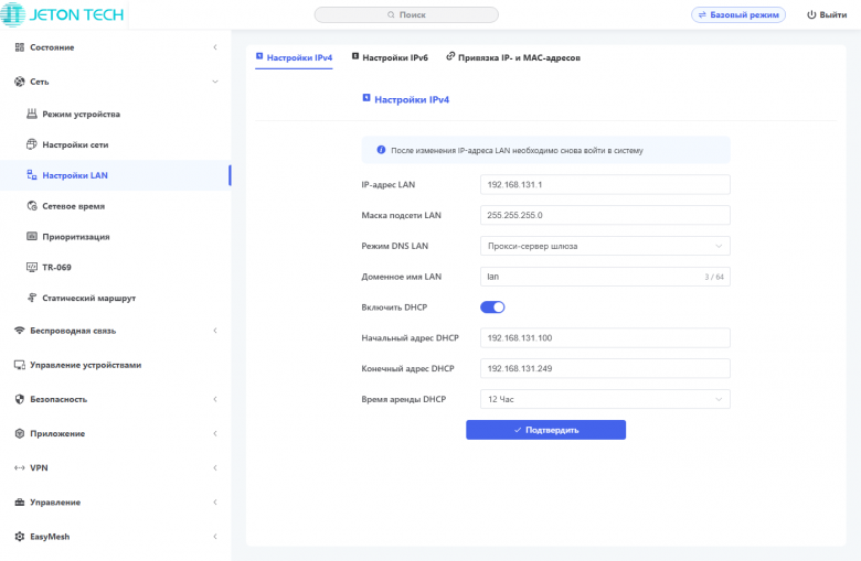 Вторая группа, «Сеть», позволяет настроить режим работы (кроме роутера, можно использовать модель как мост или репитер), подключение к провайдеру, параметры LAN (включая резервирование адресов), сервер и клиент NTP для установки времени, приоритизация и ограничение трафика, управление через TR-069 и статические маршруты. В целом все стандартно, но вот с приоритизацией тоже получилось слишком сложно для данного сегмента.