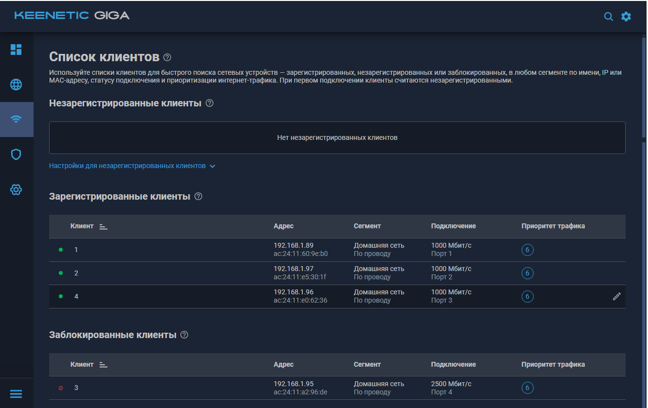 В пункте «Мои сети и Wi-Fi» представлен список клиентов, все настроенные локальные сегменты и настройки фирменной Wi-Fi-системы. Клиентов можно регистрировать, назначать им имена и адреса, ограничивать доступ и скорость, для беспроводных устройств — проверять текущие данные подключения.