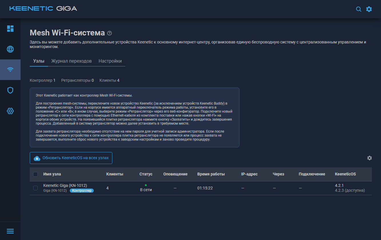 Про Mesh Wi-Fi-систему мы уже писали. Реализация Keenetic интересна своей очень простой настройкой, поддержкой беспроводных соединений между узлами, мониторингом работы и другими полезными функциями. В новых версиях прошивки появилась возможность централизованного обновления прошивки на всех узлах системы.