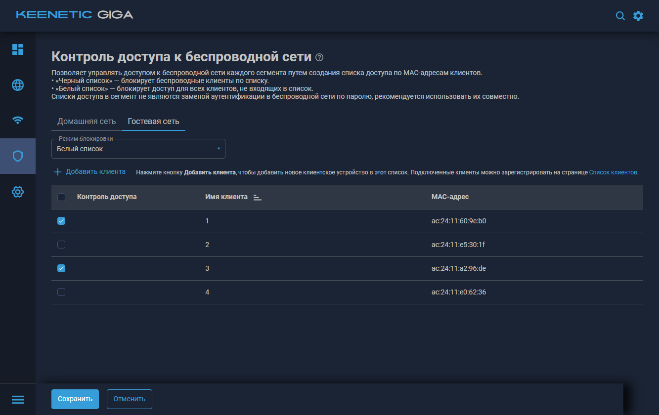 По традиции производитель реализовал и контроль доступа к беспроводной сети по MAC-адресам клиентов. Хотя, конечно, наличие в списках выбора проводных клиентов немного путает.