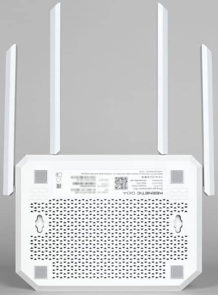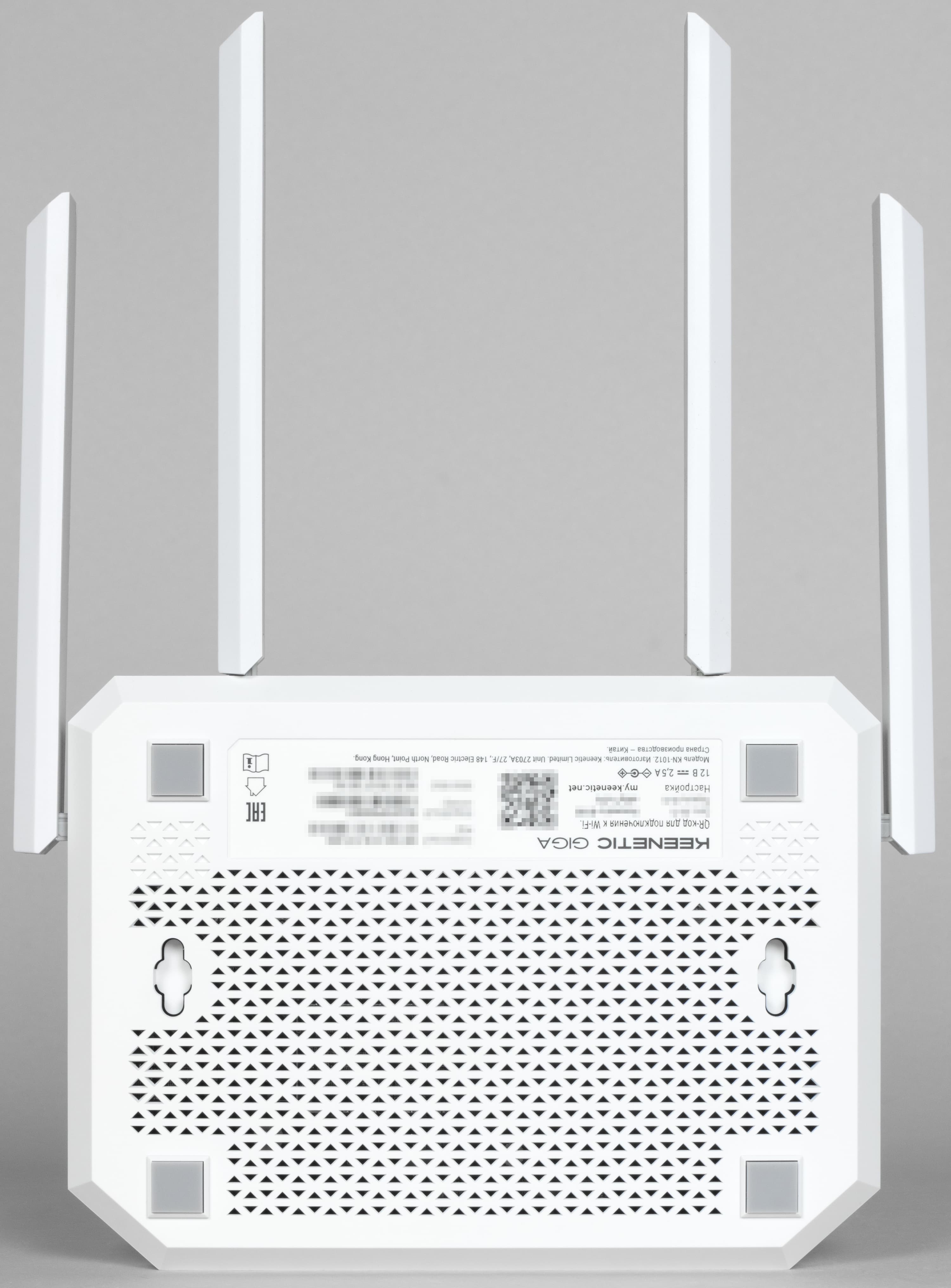 Для устойчивости на нижней поверхности есть четыре резиновые ножки. Также здесь расположена информационная наклейка с данными об устройстве — уникальные имя и пароль беспроводной сети (также и в формате QR-кода для подключения со смартфона), сервисный код, серийный номер, MAC-адрес порта WAN. Благодаря специальным отверстиям на дне можно при необходимости закрепить роутер на вертикальной поверхности разъемами вниз или вверх.