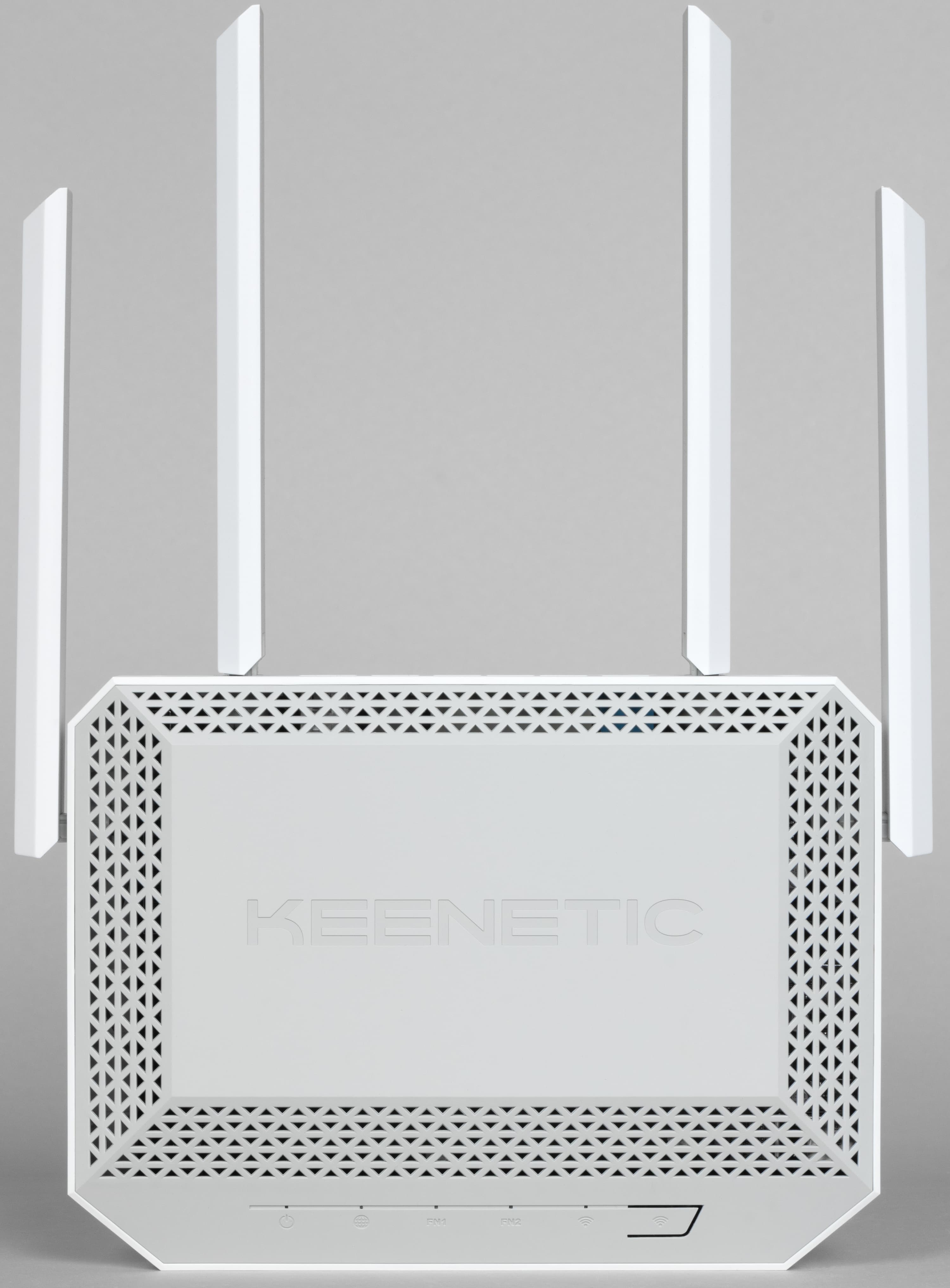 По контуру верхней крышки мы видим решетки вентиляции. Аналогичным рисунком покрыта и почти вся нижняя часть корпуса. В передней части на скосе крышки расположены пять индикаторов (питание, интернет, FN1, FN2, Wi-Fi) и кнопка управления. В решениях Keenetic назначение индикаторов FN и кнопок пользователь может изменить через настройки. Сами светодиоды очень маленькие, что можно рассматривать и как плюс (не будут мешать ярким светом в комнате), и как минус (сложно рассмотреть издалека).