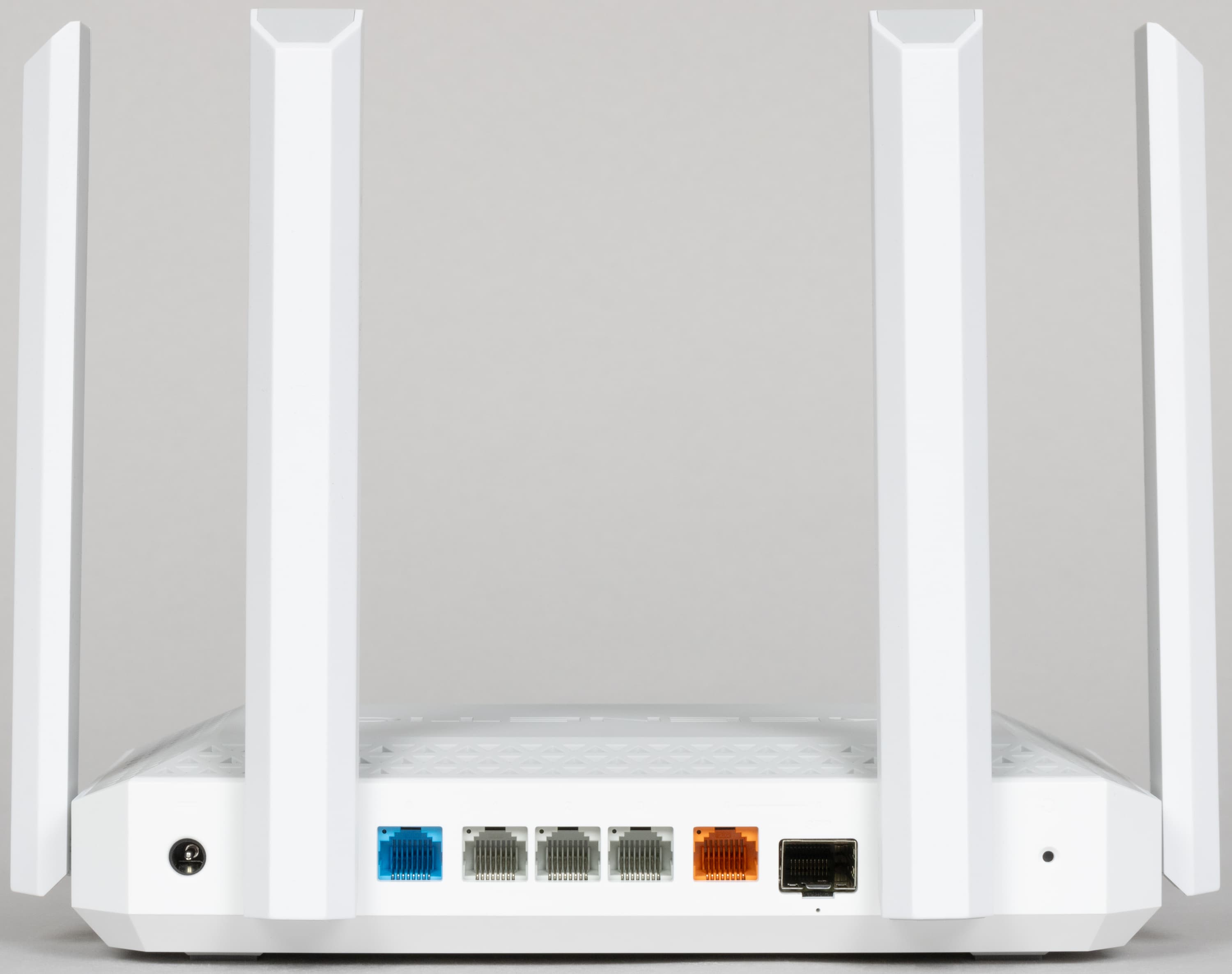 Сзади, кроме антенн, мы видим вход блока питания, голубой порт WAN, три серых порта LAN, оранжевый порт 2,5 Гбит/с, слот SFP и скрытую кнопку сброса. Все порты, включая SFP, имеют по одному индикатору, но видно их не очень хорошо. На роутерах Keenetic можно гибко назначать режимы работы портов, так что деление на WAN и LAN условно. Что касается порта 2,5 Гбит/с, то единовременно можно использовать или проводной порт, или подключение через модуль SFP.