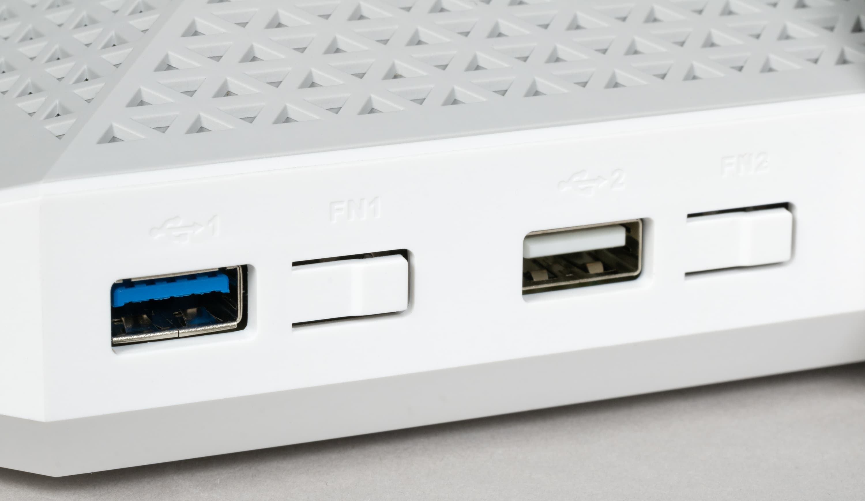 На левом торце есть только антенна, а справа находятся два порта USB (один версии 3.0 и один версии 2.0) и кнопки FN1/FN2 около них. Расстояние между портами достаточно большое (около 27 мм), так что можно установить в них крупные флешки или модемы.