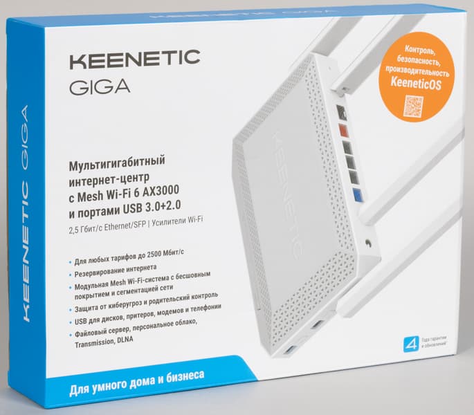 Keenetic Giga KN-1012 поставляется в коробке из крепкого картона с узнаваемым оформлением в бело-голубых тонах. На коробке есть фотография устройства, перечислены ключевые особенности и достаточно полный список возможностей. Конечно, всё это на русском языке.