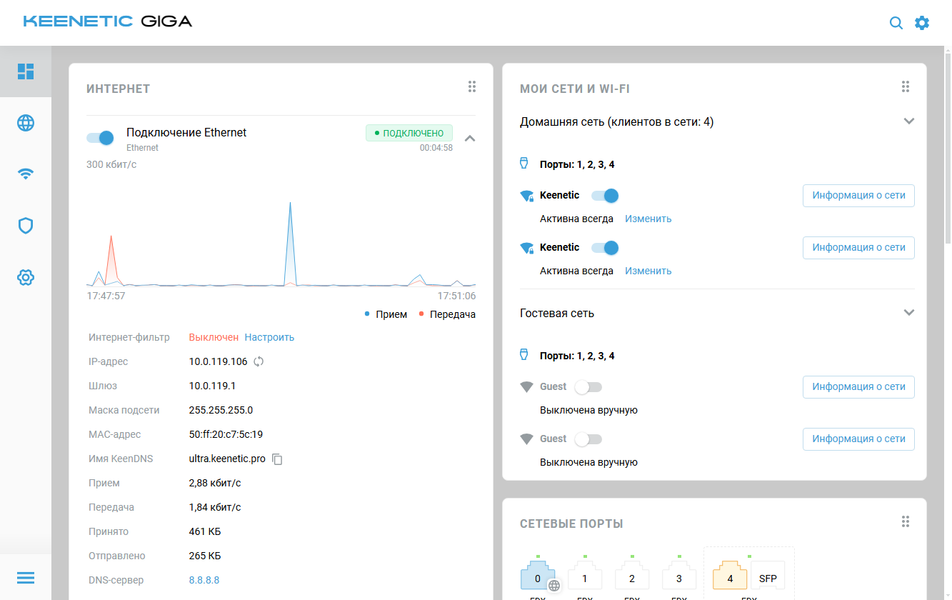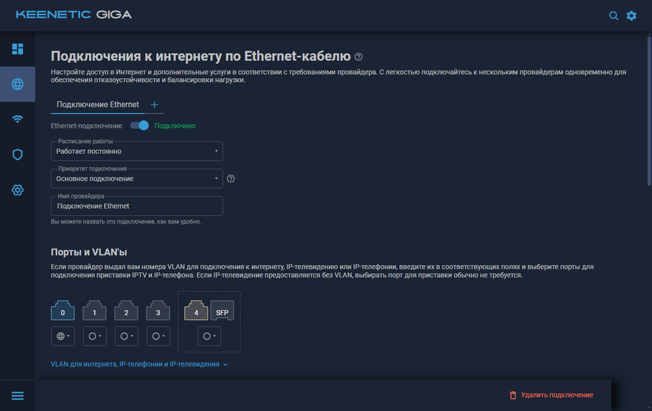 Набор сетевых портов здесь уникальный для Keenetic — четыре гигабитных порта и один порт 2,5 Гбит/с, который можно использовать или с медным кабелем, или с оптикой через соответствующий трансивер. В решениях этого производителя выбор роли портов — LAN или WAN, осуществляется в настройках, так что можно использовать любые комбинации. Но в некоторых случаях стоит учитывать особенности конфигурации для получения максимальной эффективности. В частности, «синий» гигабитный порт реализован напрямую в SoC, а остальные порты, включая порт 2,5 Гбит/с, работают через внешний коммутатор MT7531AE. Он обеспечивает, в том числе, поддержку VLAN и возможность агрегации портов 1 и 2. А вот знакомая по некоторым прошлым моделям функции диагностики сетевого кабеля в текущей прошивке у рассматриваемой есть только в порту 2,5 Гбит/с.