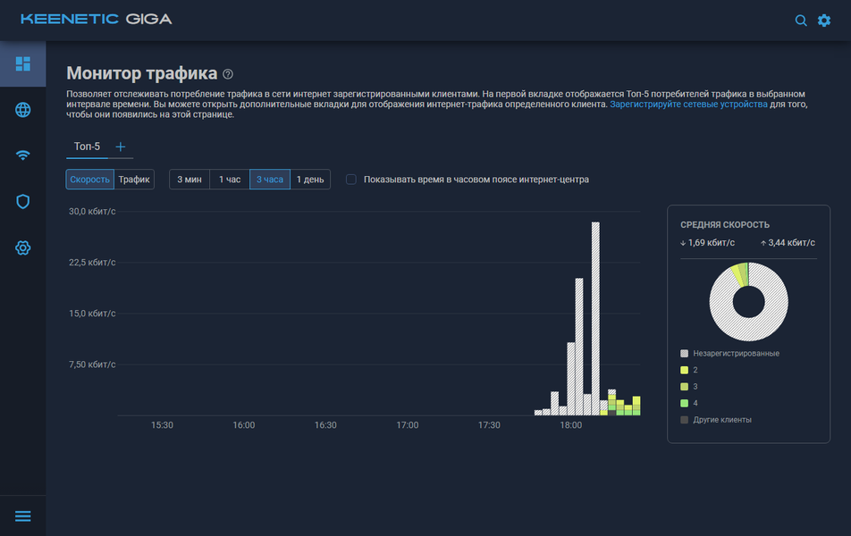 В мониторинге трафика для зарегистрированных клиентов можно смотреть потребление как по скорости, так и по объему данных. При этом шкала времени представлена в четырех вариантах — три минуты, час, три часа и день.