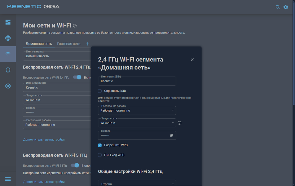 В предустановленном сегменте «Домашняя сеть» настраиваются параметры беспроводных точек доступа. В дополнение к привычным пунктам имени, пароля, канала, можно выбрать мощность передатчика, регион, расписание работы, активировать разные дополнительные параметры беспроводных протоколов.