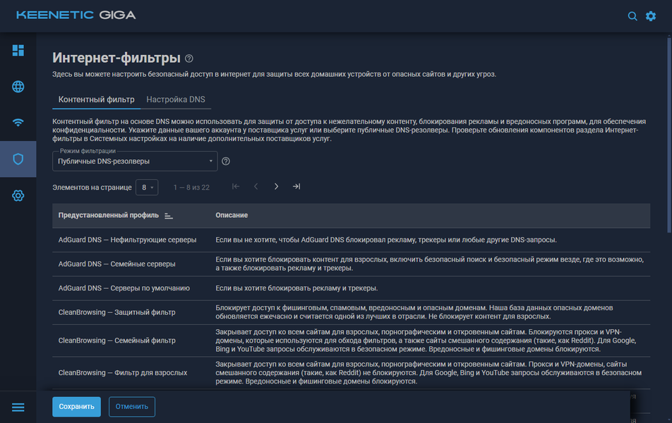 Раздел сетевых правил открывают настройки Интернет-фильтров. Они работают также на базе профилей, назначаемых сегментам и клиентами, и внешних сервисов DNS. При этом есть возможность блокирования использования собственных настроек серверов DNS у клиентов.