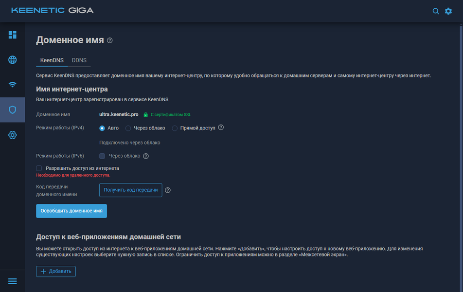 Фирменная функция KeenDNS никуда не делась. Напомним, что благодаря ей, в частности, можно получить защищенный доступ к локальной сети и ее сервисам даже при отсутствии «белого» адреса от провайдера. Также она используется для удаленного управления и подключения с мобильного приложения.