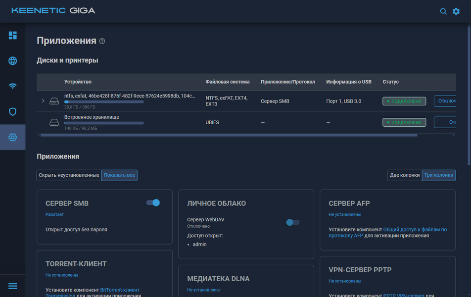 Страница «Приложения» произведет впечатление даже на опытных сетевых специалистов: здесь широко представлены (в случае установки соответствующего модуля в прошивку) сервисы по работе с USB-накопителями и реализации технологий VPN. При этом поддерживается встроенная база пользователей, так что можно будет гибко назначать права.
