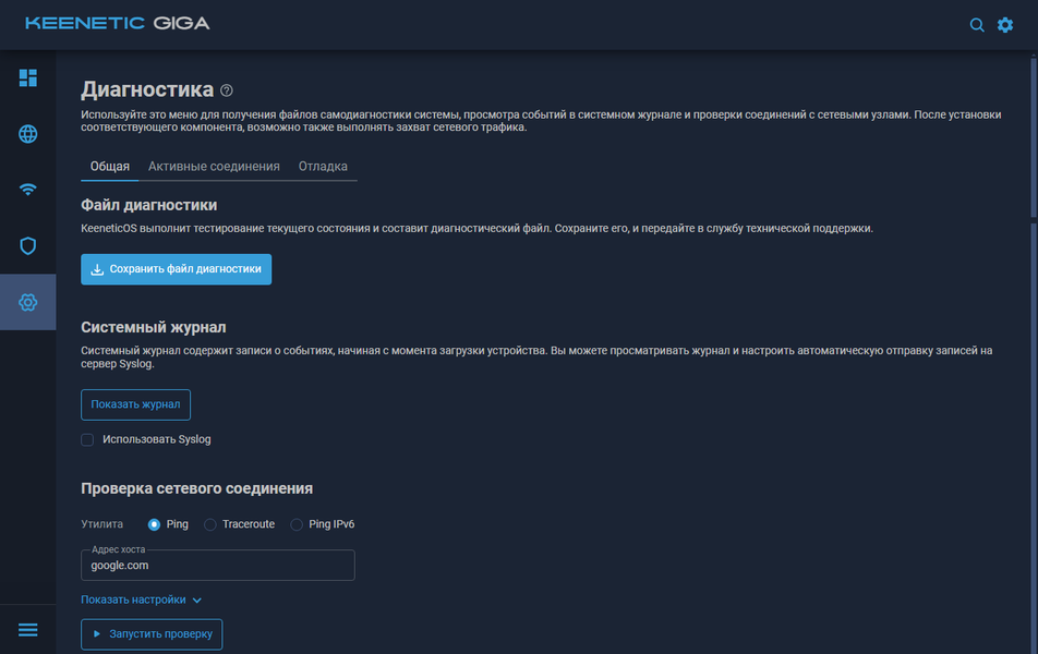 Последняя страница — диагностика. Кроме привычного журнала событий и утилит проверки сетевых коммуникаций, здесь есть расширенные функции для решения проблем через техподдержку производителя — отправка файла диагностики, увеличение детальности системного журнала. В сложных случаях может пригодиться захват сетевых пакетов, реализованный, как нетрудно догадаться, отдельным модулем.