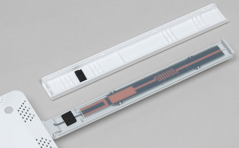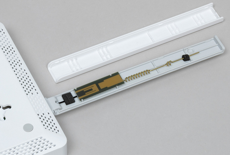 Остальная часть корпуса тоже матовая, но уже белая. На дне есть как резиновые ножки, так и специальные отверстия для настенного крепления (в любом варианте ориентации антенн).