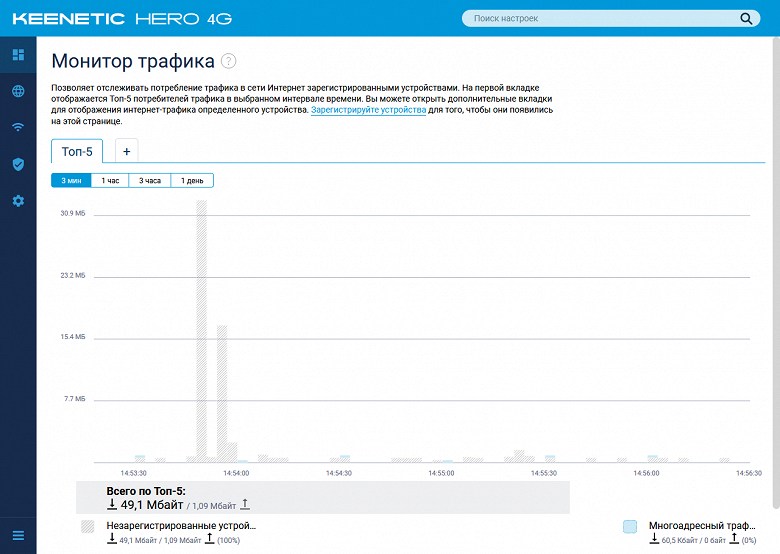 Относительно недавно в интерфейсе появилась страница мониторинга трафика хостов. Устройство собирает статистику по своим клиентам, так что вы сможете посмотреть, кто больше всего скачал. При этом предусмотрены разные временны́е интервалы — от трех минут до одного дня.