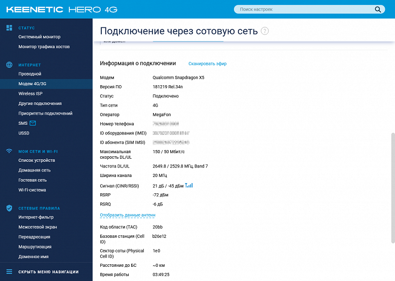 Еще больше технических данных представлено на странице «Подключение через сотовую сеть». Здесь можно узнать номер телефона, максимальные скорости, частоты, Band, ширину канала, номер базовой станции, оценку расстояния до нее, а также отчеты по антеннам. Конечно, многое из это пригодится только в случае сложной ситуации с приемом сигнала, когда нужно выбрать оптимальное место расположение роутера и антенн.