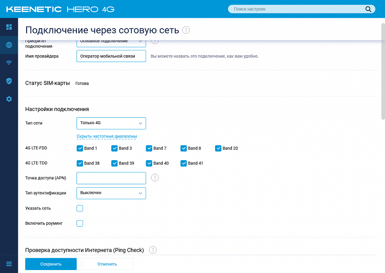 Из доступных пользователю настроек сотового модуля в интерфейсе роутера представлены выбор диапазона (Авто, 3G, 4G) и выбор Band.