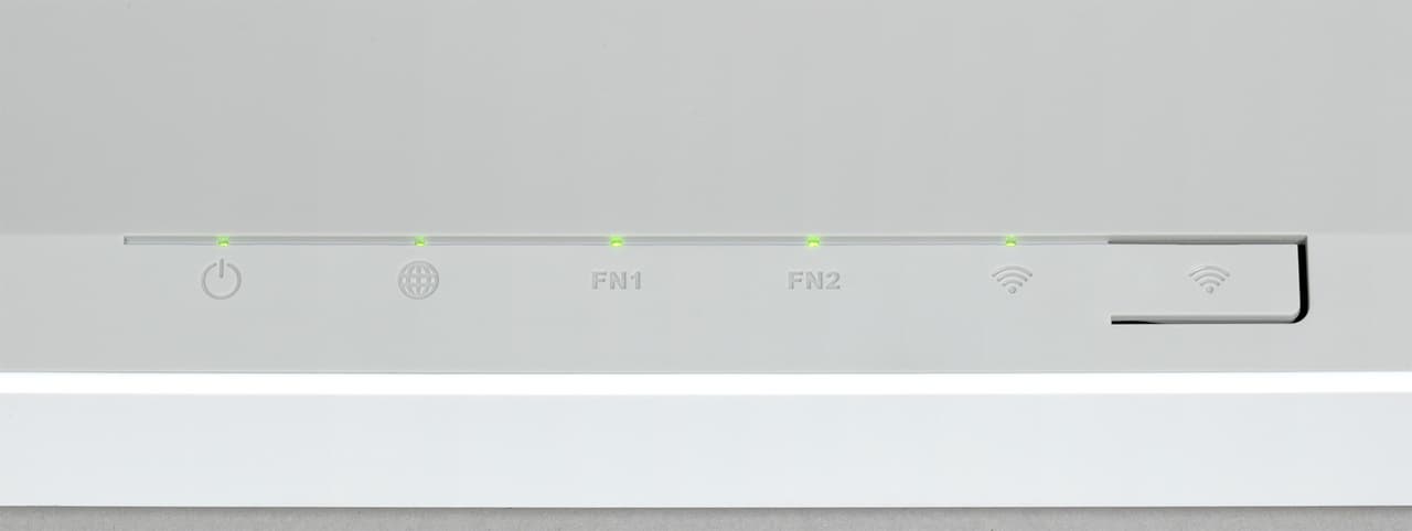 В передней части верхней панели есть скос, на ребре которого разместили светодиодные индикаторы — питание/состояние, подключение к интернету, пользовательские FN1 и FN2, Wi-Fi. Здесь же находится и кнопка управления Wi-Fi (на самом деле много функциональная — ее назначение можно изменить в настройках).