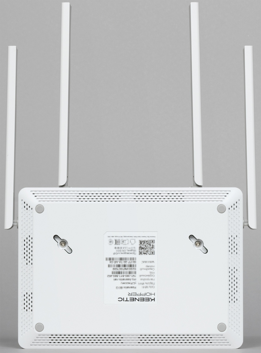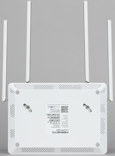 На дне в центре разместили информационную наклейку с данными о роутере. Напомним, что у Keenetic все устройства идут «из коробки» с уникальным именем беспроводной сети и сложным паролем. Так что беспроводная сеть с самого первого включения будет защищена.