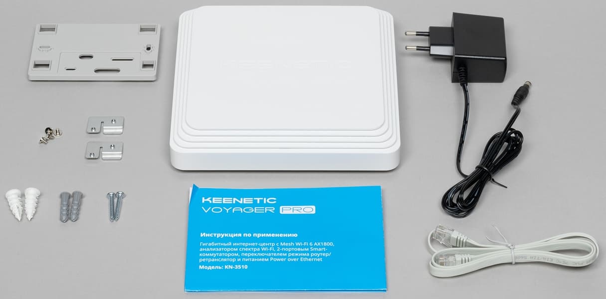 В комплект поставки входят блок питания, патч-корд, листовка-инструкция, комплект крепежа. Блок питания вполне обычный — компактная модель для установки в розетку, кабель 1,5 м, параметры, круглый штекер 5,5 мм, параметры 12 В 1,5 А (у Orbiter Pro — 1 А). Патчкорд обычный — серый, плоский, гигабитный, длина один метр, разъемы укороченные.