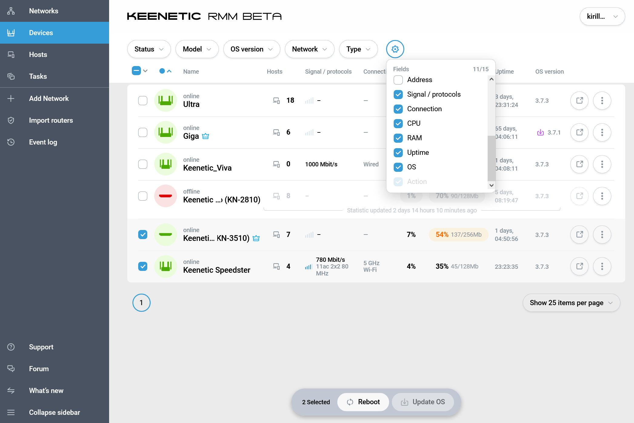 В левой части окна идет основное меню. Вторым пунктом в нем идет список устройств («Devices»). Обратите внимание, что здесь уже будут показаны все добавленные в сервис устройства — как контроллеры, так и дополнительные узлы. В этом окне тоже есть выбор столбцов и установка фильтра. При этом для устройств здесь будет показаны такие данные, как нагрузка на процессор и оперативную память, время работы, версия прошивки. Кроме операции перехода на веб-интерфейс, предусмотрена отправка команды перезагрузки для главных узлов (они выделены в списке «коронами») и обновление прошивок. Причем можно поставить галочки и выбрать сразу несколько устройств для проведения операций.