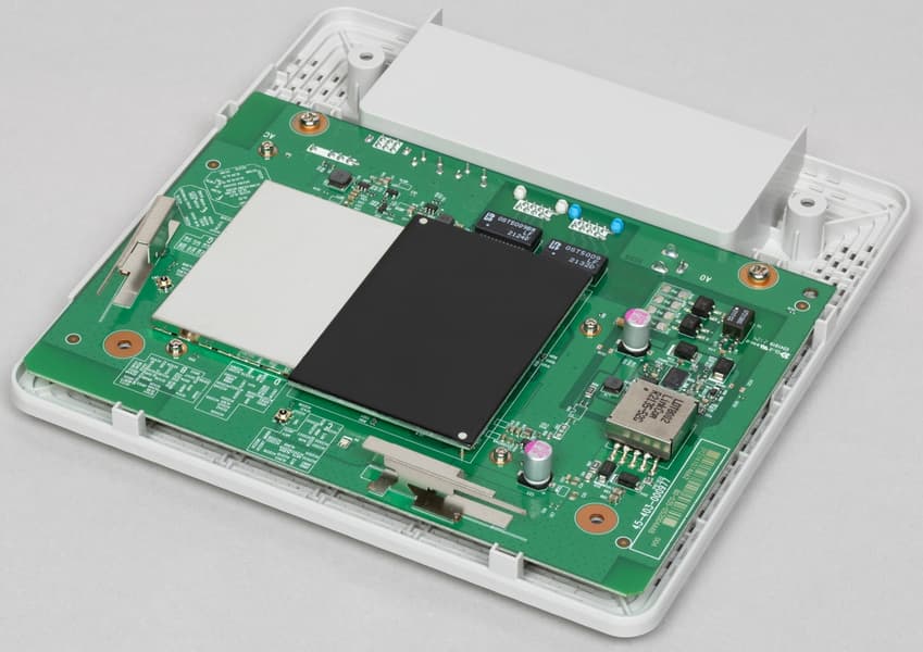 Кроме традиционных резиновых ножек предусмотрено крепление к специальной пластиковой рамке. Она, в свою очередь, может быть установлена на стене или потолке через отверстия и шурупы или с применением специальных захватов на рейке подвесного потолка. Корпус интернет-центра просто защелкивается на этой рамке, никаких дополнительных винтов здесь нет. Для снятия нужно просто сдвинуть корпус.