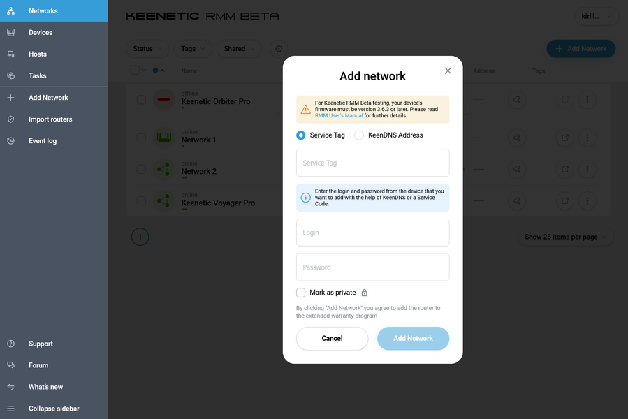 Добавление новых сетей осуществляется в одноименном пункте меню. Для этого необходимо иметь или сервисный код или имя KeenDNS главного устройства, а также логин и пароль администратора. Чекбокс «Mark as private» означает, что доступа у команды к этой сети не будет. Следующий пункт — добавление непосредственно отдельных устройств, что уже есть в личном кабинете пользователя.